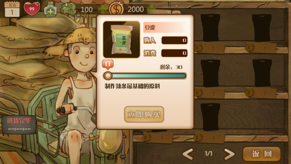 进货不光是补货 ,从一家小小的店铺起步,玩家可以将不同的原材料进行组合解锁更多不同口味的辣条,通过自己的努力和智慧,